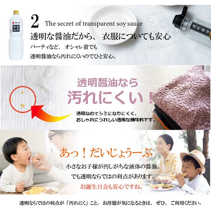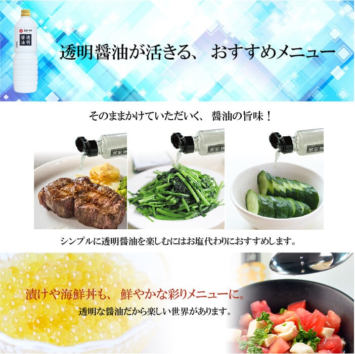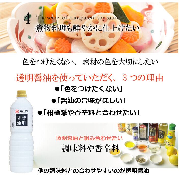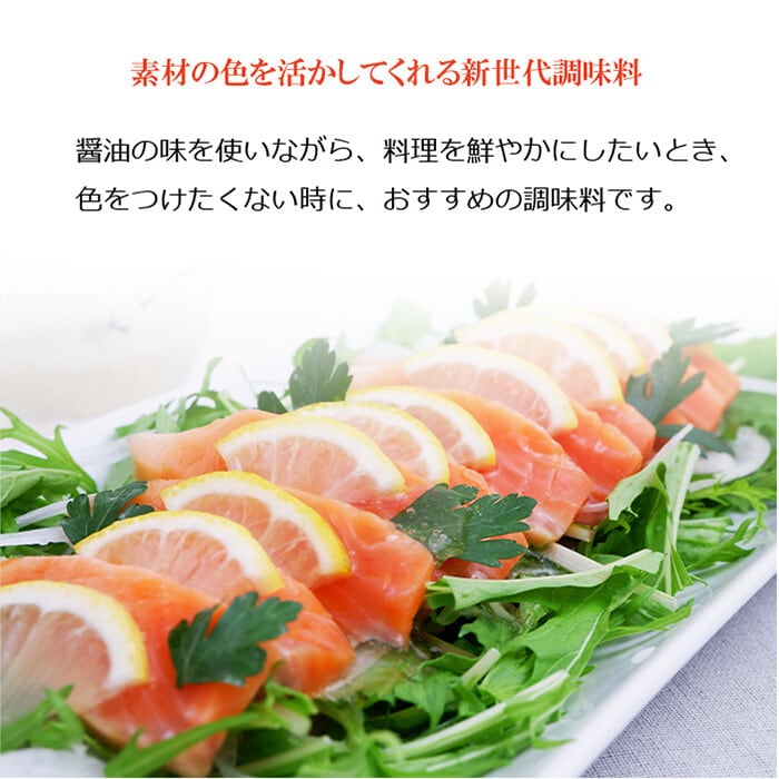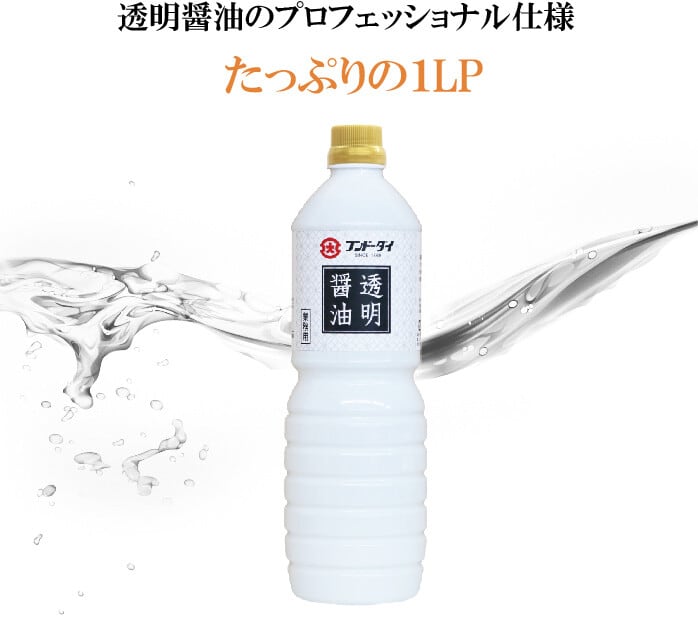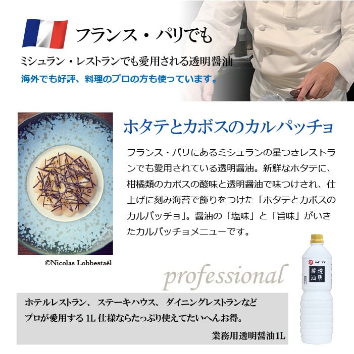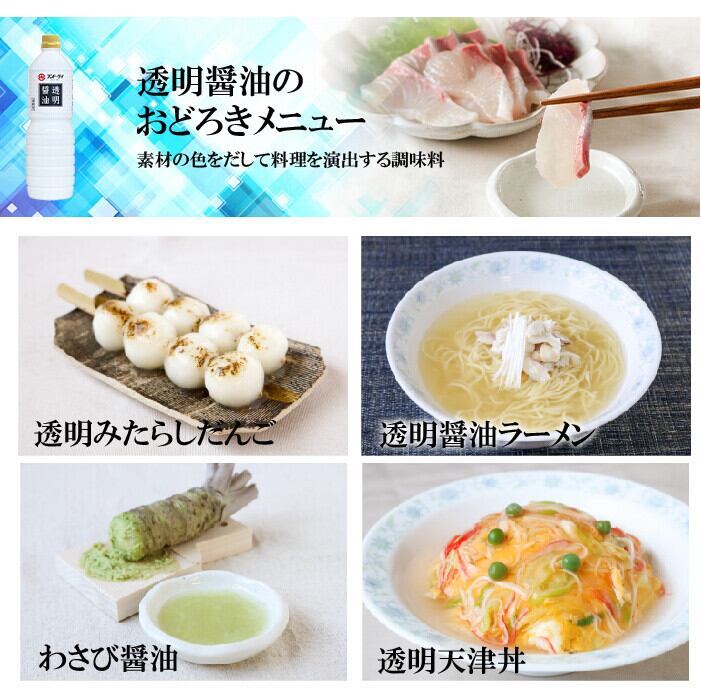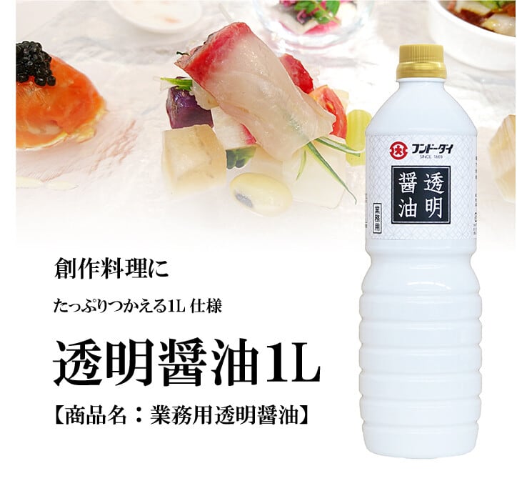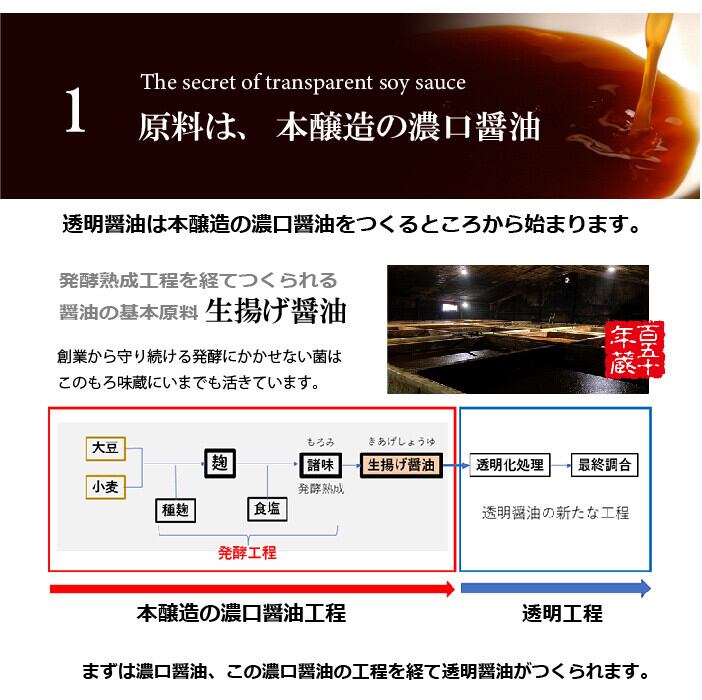 濃口醤油を原料に、透明化処理をした透明な醤油。醤油は黒いという常識を覆し、汚れずらいという点はもちろん、新世代の醤油として和食だけでなく、西洋料理に使っていただける旨味調味料としておすすめです。イタリアン、フレンチ、創作料理にぴったりです。醤油の旨味を様々な料理にお試しください。