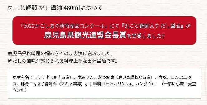 少数生産  鹿児島  サクラカネヨ  丸ごと鰹節  だし醤油 480ml